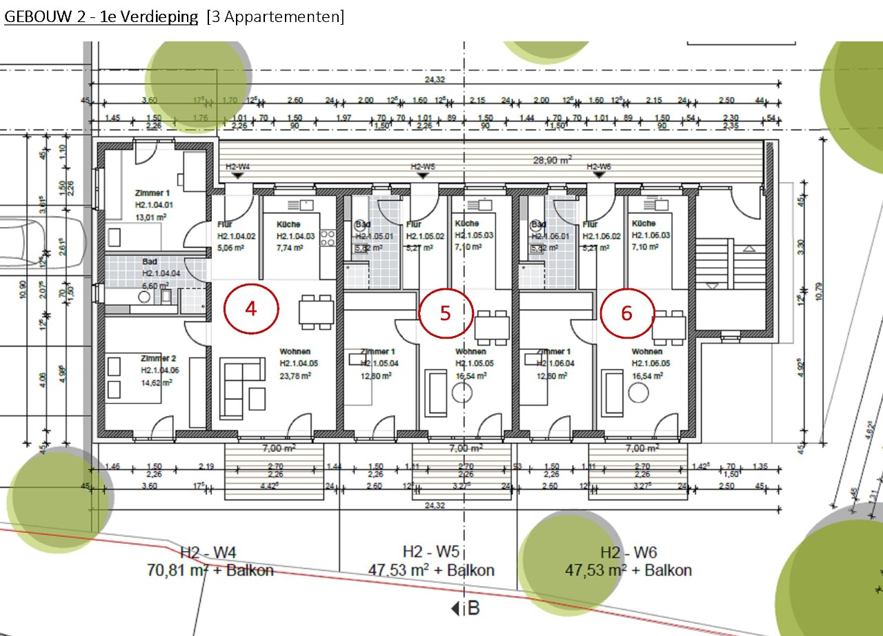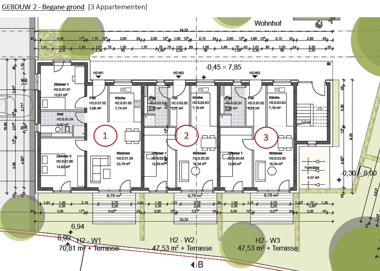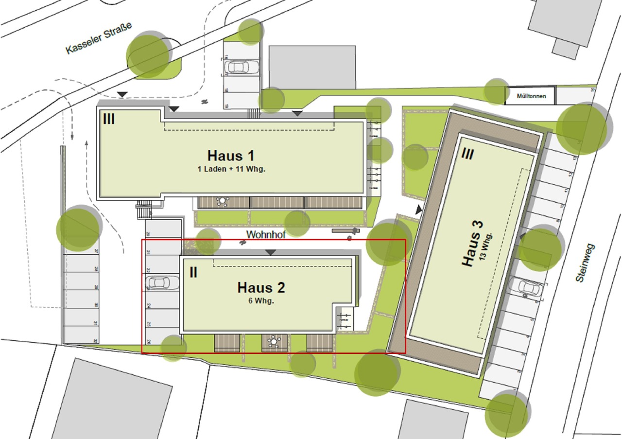 De hoofdingang van dit gebouw ligt aan de noordzijde, achter gebouw 1. aan de Kasseler Strasse. Op de begane grond bevindt zich één groter 3-kamerappartement [75,19 m2] en twee ruime 2-kamerappartementen [51,91 m2]. Behalve een eigen terras beschikken deze 3 appartementen eveneens nog over een bijkomend stuk tuin.